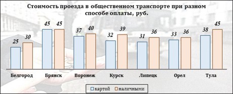 Больше всех за проезд в общественном транспорте платят жители Брянска. С 11 января стоимость одной поездки здесь составляет 45 руб. В этот раз в городской администрации отказались от разделения тарифов по способу оплаты. Ранее у пассажиров с банковской карты списывалось по 35 руб., а наличными за одному поездку люди отдавали 37 руб.