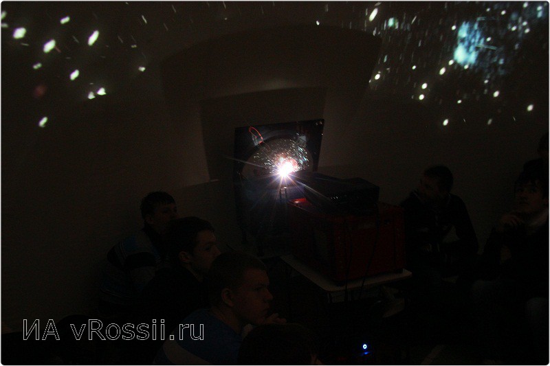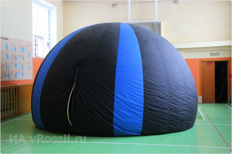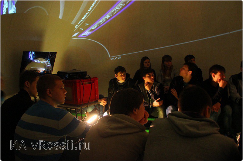 Большой кусок брезента, чем-то напоминающий батут, постепенно надувался и приобретал форму палатки. Это был тот самый переносной купол, который астрономы на этот раз привезли в Брянский колледж физической культуры. "Здесь может поместиться 25 человек, - объясняет мне Людмила Новикова. Вскоре завуч колледжа привела студентов, которые аккуратно зашли в купол и заняли свои места. Погас свет, астроном включил проектор, и над нами появилась целая плеяда звездочек. А затем началось самое интересное — путешествие по солнечной системе.
