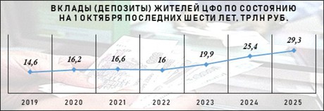 Жители ЦФО хранят на банковских вкладах (депозитах) рекордную сумму денег. По данным Центробанка, по состоянию на 1 октября объем сбережений населения составлял 29,3 трлн руб. За год совокупный размер вкладов увеличился на 15% или почти на 4 трлн руб.