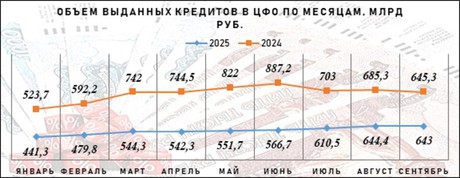 Снижение объемов кредитования повлияло на задолженность населения по финансовым обязательствам. За год, т.е. конец сентября 2025 г. сопоставляем с аналогичным временным отрезком прошлого года, сумма невозвращенных средств уменьшилась на 3%. На 1 октября жители ЦФО должны финансовым организациям 10,7 трлн руб. В прошлом году к середине осени эти цифры составляли 11 трлн руб.