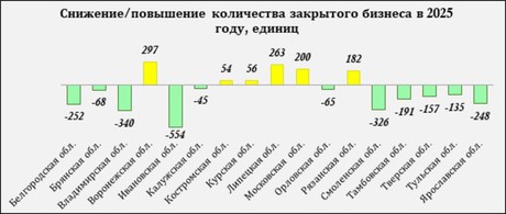 По сравнению с 2024 годом, количество закрытых бизнесов выросло на 25,3 тыс. единиц. При этом во всем ЦФО сложилась очень необычная ситуация. Лишь в 7 из 18 регионов выросло число ликвидированных компаний. Соответственно во всех остальных субъектах количество коммерческих организаций, прекративших свою деятельность, наоборот снизилось.