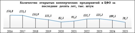 Наибольший вклад в общую негативную тенденцию внесла столица. В 2025 году закрылось 82,4 тыс. компаний против 55,8 тыс. в 2024 году. Т.е., за год число ликвидированных организаций в главном городе страны выросло на 26,6 тыс. или в 1,5 раза. Тогда как во всем Центральном округе общее количество бизнес-учреждений, прекративших работу, уменьшилось на 1,3 тыс. – 30,7 тыс. против 32 тыс.