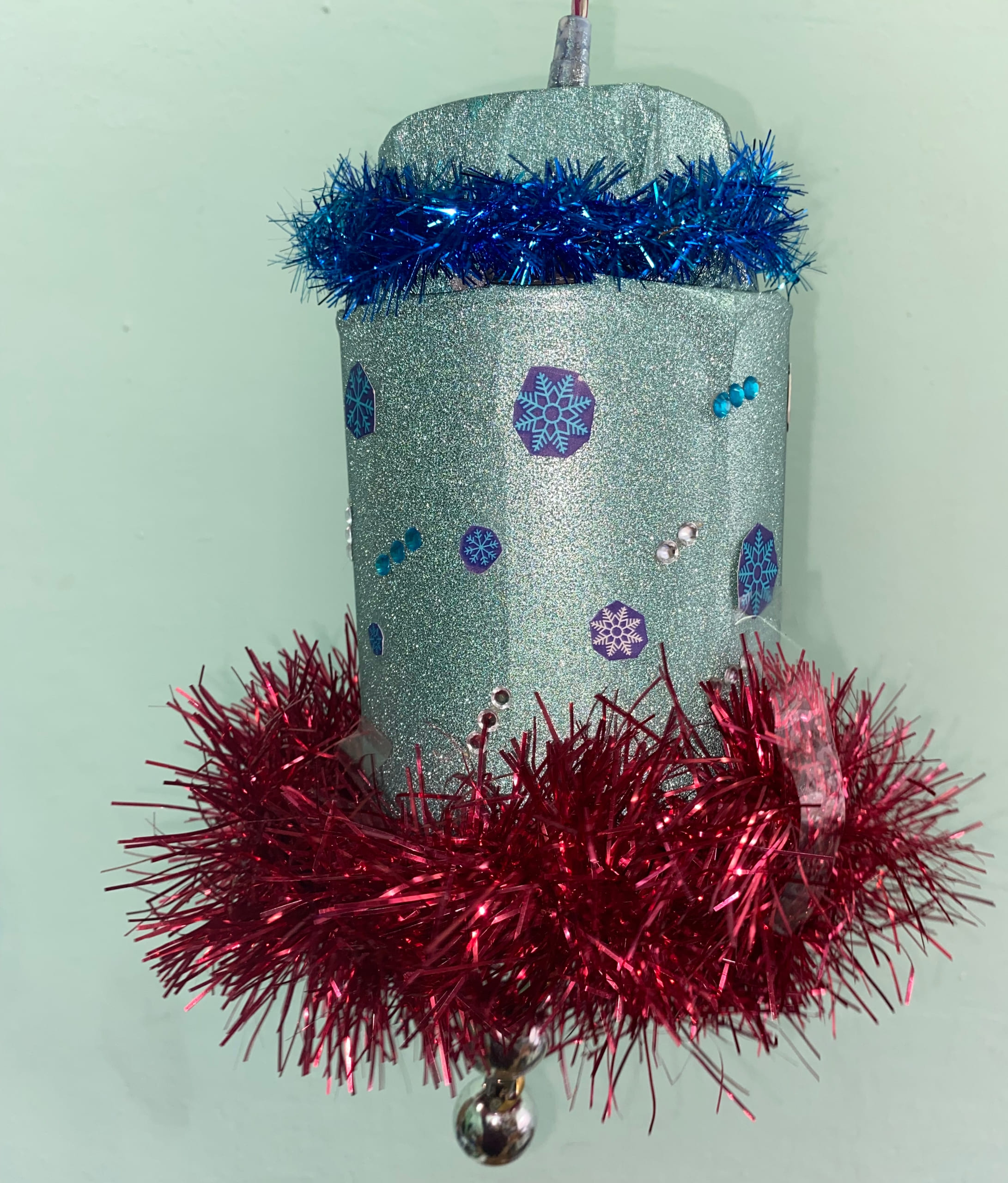 Описание: Серебристая блестящая игрушка в форме маленького фонарика, украшенная синим и красным мишуром и звенящим колокольчиком внизу. Добавит ёлке ярких акцентов, бликов и праздничного настроения.