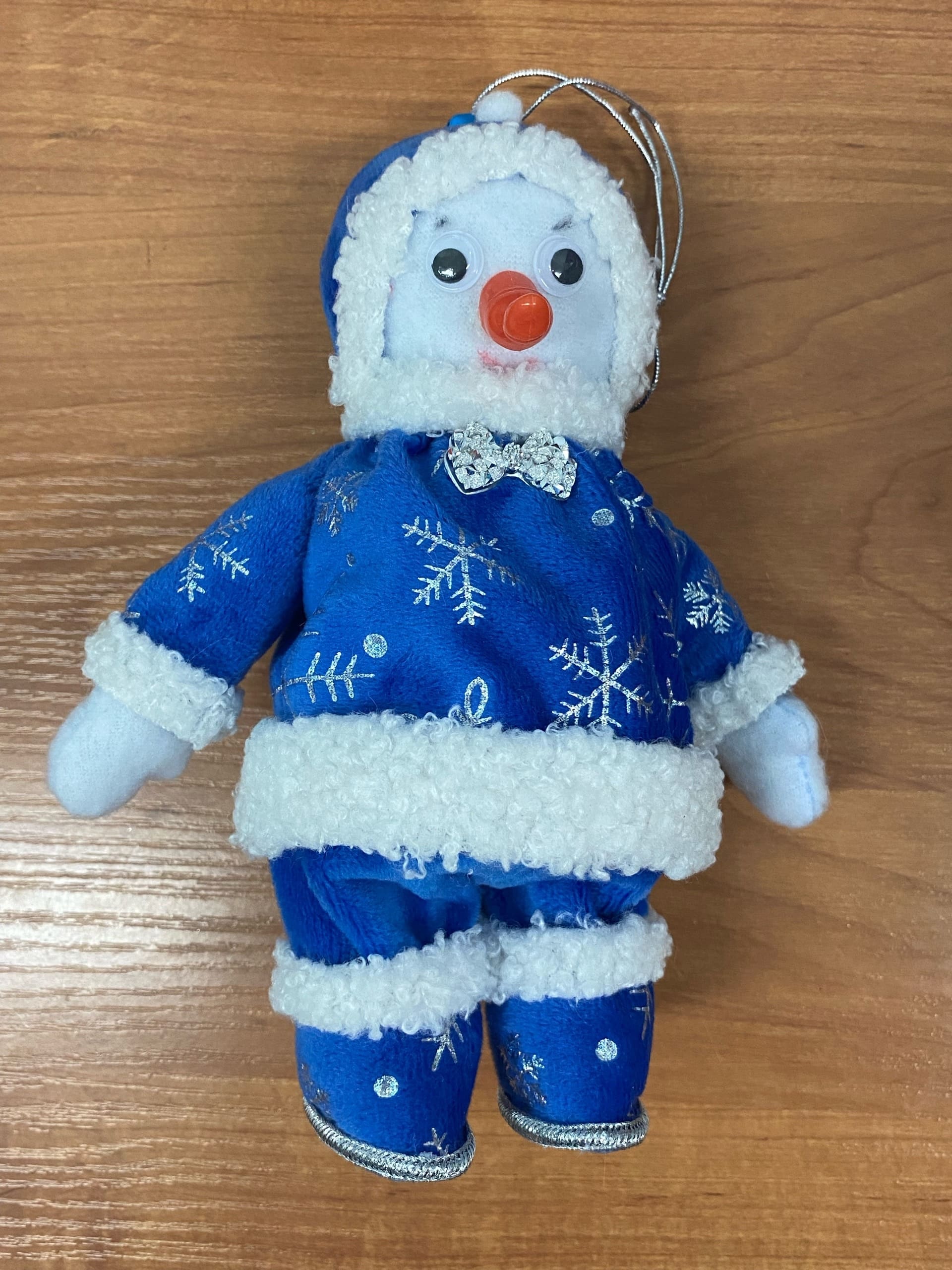 Описание: Мягкая ёлочная игрушка — милый снеговичок в бархатистом синем костюмчике с узором снежинок, пушистой белой оторочкой и забавным морковным носиком.