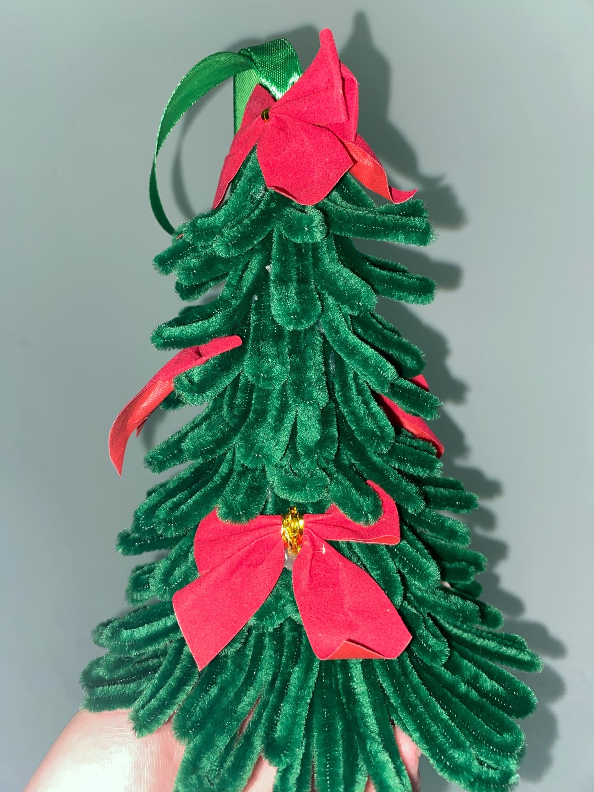 Описание: Небольшая ручная игрушка в форме ёлочки — из зелёных пушистых проволочек (chenille) с яркими красными бантиками и ленточкой для подвешивания.