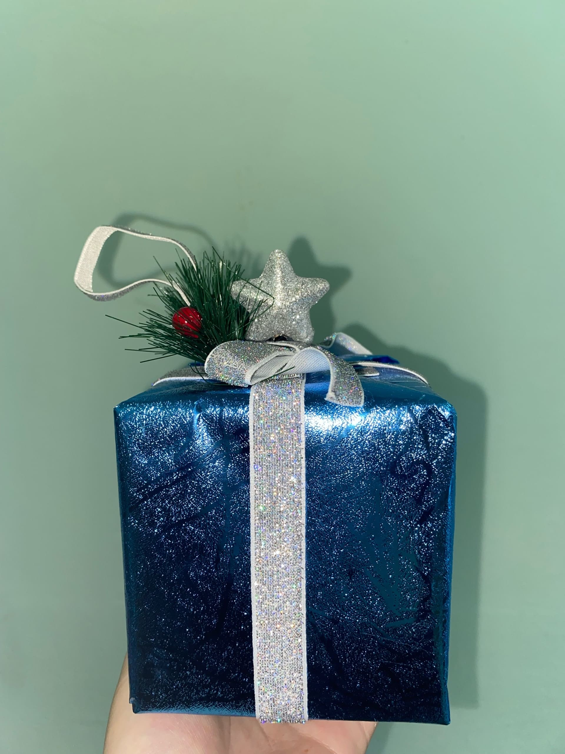 Описание: Стильная елочная игрушка в форме подарка: насыщенный блеск синей обёртки и мерцающая ленточка создают элегантный акцент.