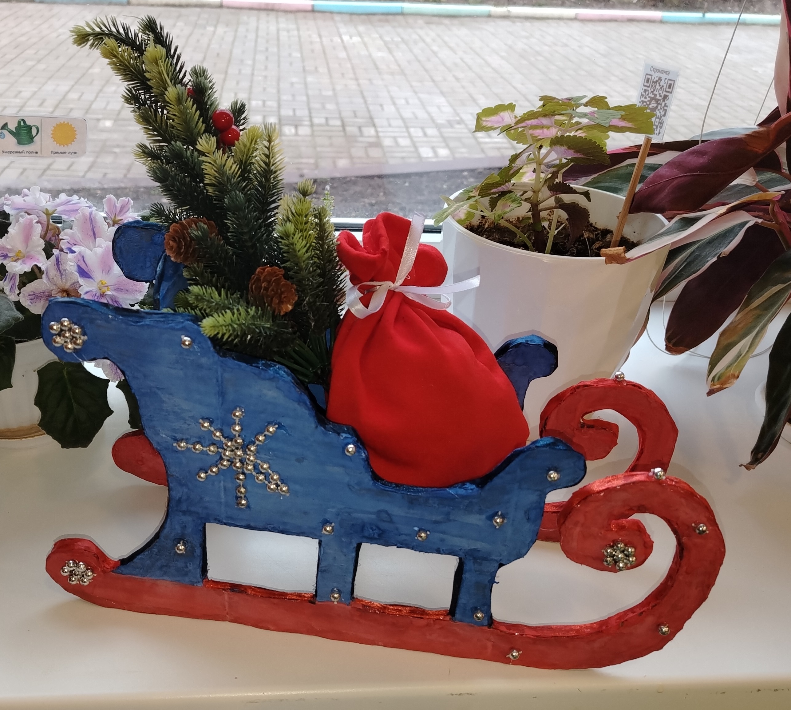 Описание: Сани сделаны из картона, окрашены гуашью, украшены декором, мешок выполнен из ткани