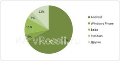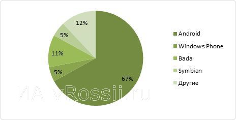 Структура проданных смартфонов в 1 квартале 2013 по операционным системам (в штучном выражении) выглядит следующим образом:
