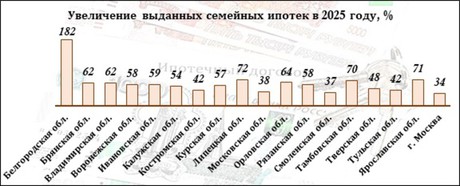 Самая большая прибавка год к году отмечается в Белгородской области. За январь-декабрь количество оформленных сделок с банками по льготным займам выросло почти в три раза. На 70 и более процентов увеличилась выдача семейной ипотеке в Тамбовской, Ярославской и Липецкой областях. В столице, Смоленской и Московской областях число предоставленных кредитов на жилье возросло минимум на треть от показателей 2024-го года.