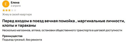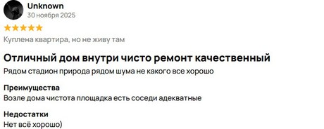 На этом же сайте в отзывах соглашаются с информацией из объявления. Например, неизвестный пользователь отмечает чистоту вокруг дома, наличие площадки и адекватных соседей. Близость к природе и избавление от городского шума только подчеркивают достоинства жилья.