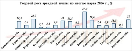 С начала 2026 года арендная плата выросла в большинстве регионов округа. Самые заметные изменения в большую сторону с января по март наблюдаются в Смоленской (+9,8% или 1,7 тыс.), Московской (+4,4% или 1,6 тыс.) и Тульской (+3,5% или 1 тыс.) областях. Противоположные тенденции, т.е. уменьшение арендной платы, характерны для столицы, Курской и Брянской областей. В этих регионах снижение составило 500-600 рублей.