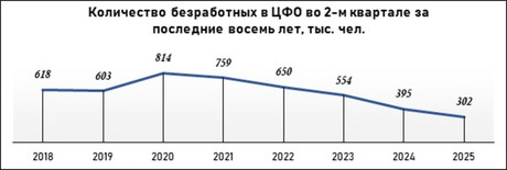По итогам второго квартала 2025 года кадровый резерв в ЦФО снизился до минимальных значений. По данным Росстата, к концу июня совокупное количество безработных, потенциальной рабочей силы и тех, кто желает работать, но не просматривает объявления с вакансиями и не готов приступить к труду, составляло 907 тыс. человек. Это на 11,5% или на 118 тыс. меньше относительно аналогичного периода прошлого года.