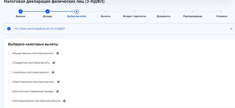 На главной странице в разделе "Доходы" или "Вычеты" нажимаем на вкладку "Декларации". Затем кликаем на ссылку "Подать декларацию" и выбираем способ – заполнение онлайн или загрузка готового документа. При онлайн-заполнении выбираем отчетный год, указываем действующий номер телефона. Затем в разделе "Доходы" обозначаем источник доходов. В пункте "Выбор вычетов" указываем интересующий вид налогового вычета и заполняем пустующие графы.