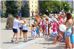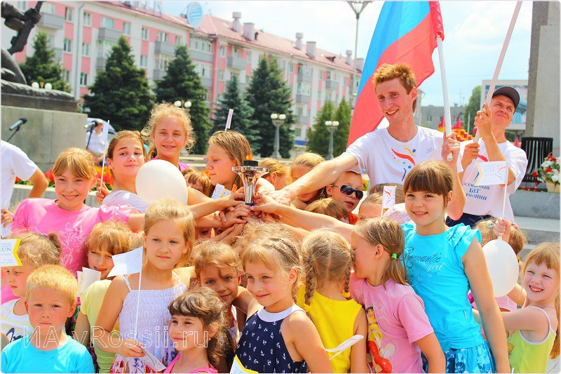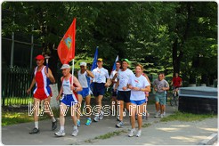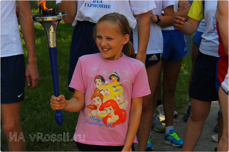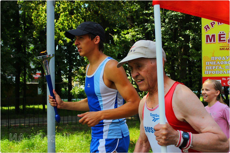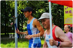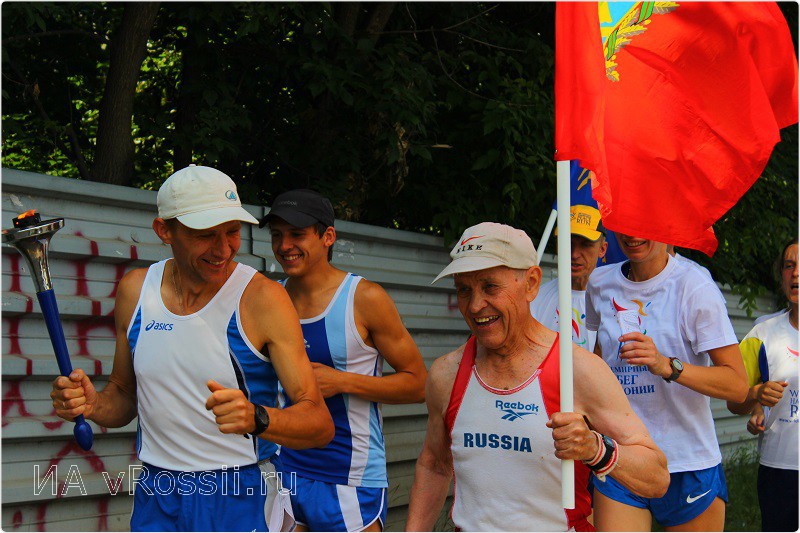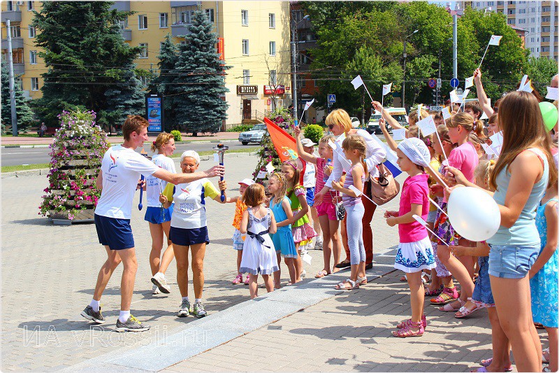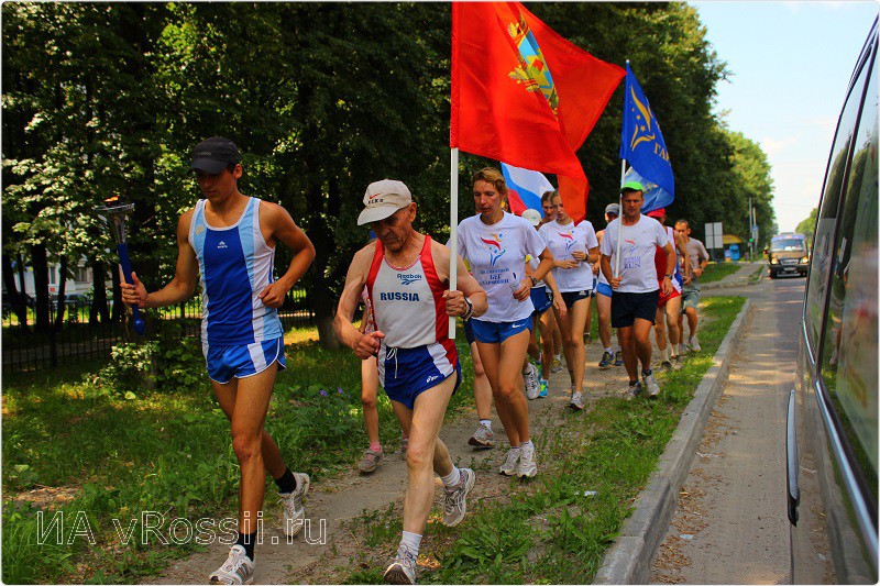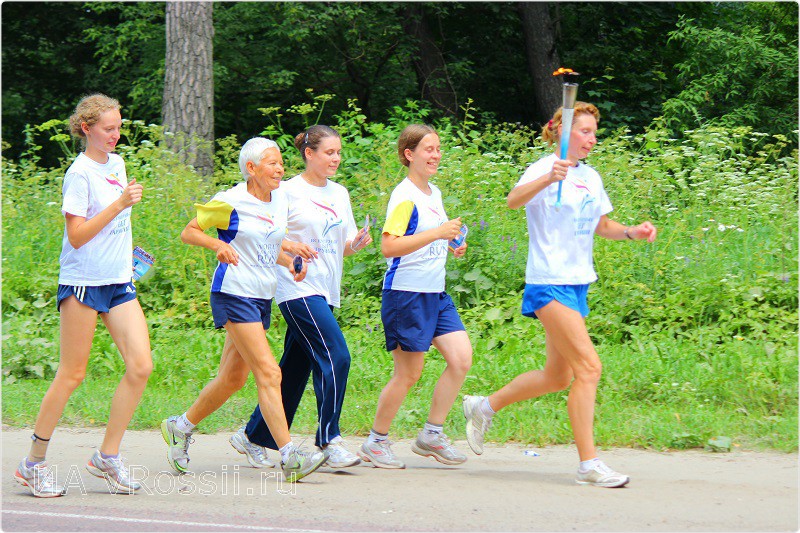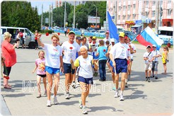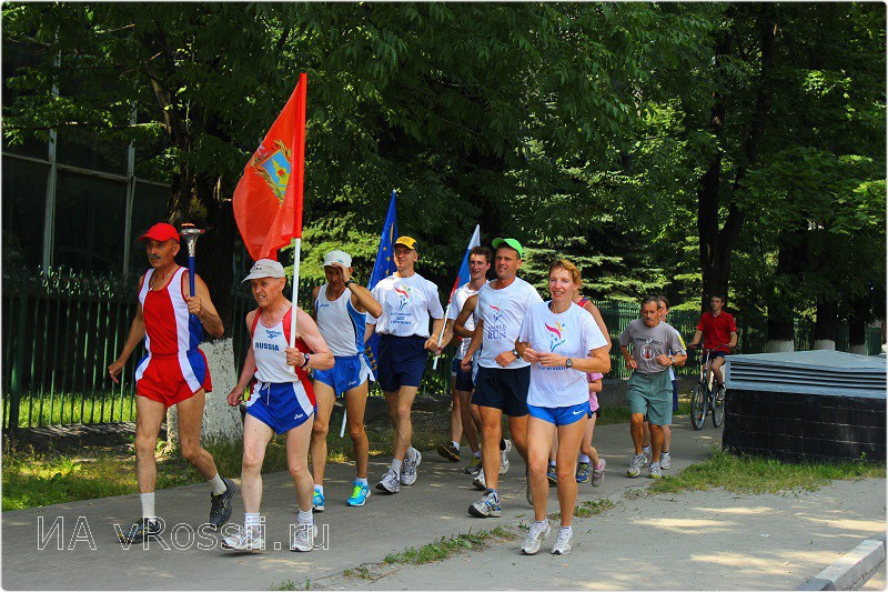 Прозвучала команда "Марш", и все атлеты с флагами и олимпийским факелом двинулись по тротуару. Факел участники эстафеты передавали друг другу. Несла его и 10 летняя Катя, и 70-летний Виктор Сергеевич. Пробежав памятник пилотам, спортсмены оказались в оживленной части города. Они встречали прохожих, приветствовали их и раздавали листовки с информацией об эстафете.