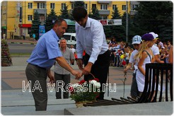 В районе автовокзала эстафета благополучно преодолела туннель подземного перехода и вышли на финишную прямую. Когда же бегуны добрались до площади Партизан, там звучала торжественная музыка, а малыши с шариками и гвоздиками их встречали. Затем прозвучали гимн России и Брянской области, и начался митинг.