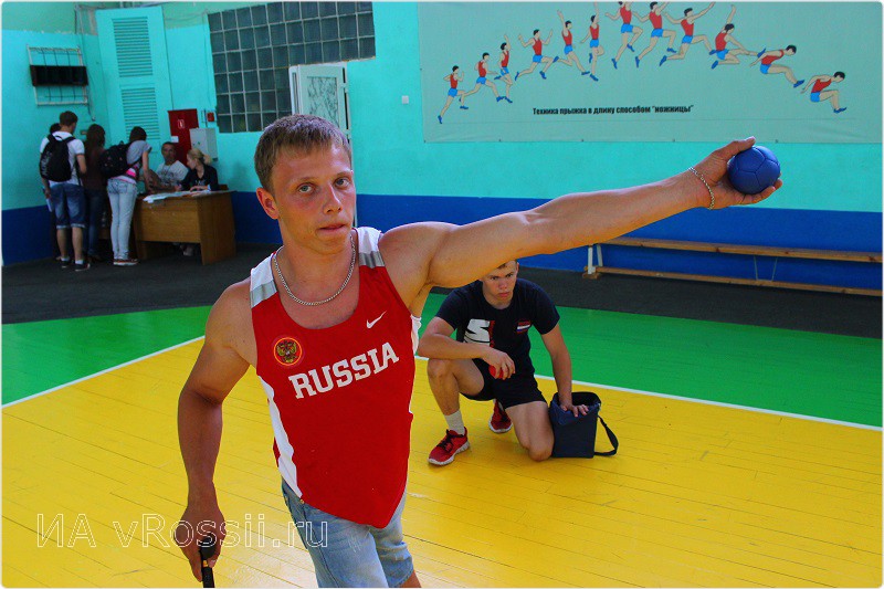 Любая тренировка начинается с разминки. Легкоатлетическая — не исключение. Перед тем, как приступить к сложным физическим упражнениям, ребята разминают свои мышцы. А затем, выслушав указания тренера, приступают к выполнению различных физических упражнений. Тренируются здесь в основном метатели. Поэтому сначала по спортивному залу Брянского спортивного колледжа летают тяжелые мячи.